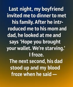 After introducing me to his parents, he turned to me with a grin and said, “Hope you brought your wallet—we’re really hungry.” I completely froze.
