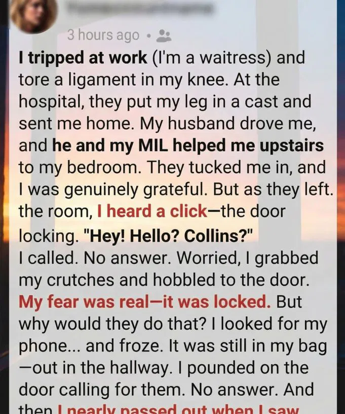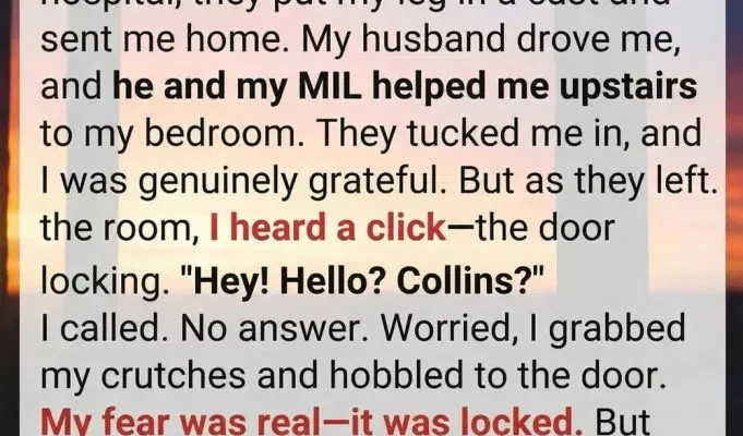 Uneasy, I grabbed my crutches and shuffled to the door. My stomach dropped—it was locked.