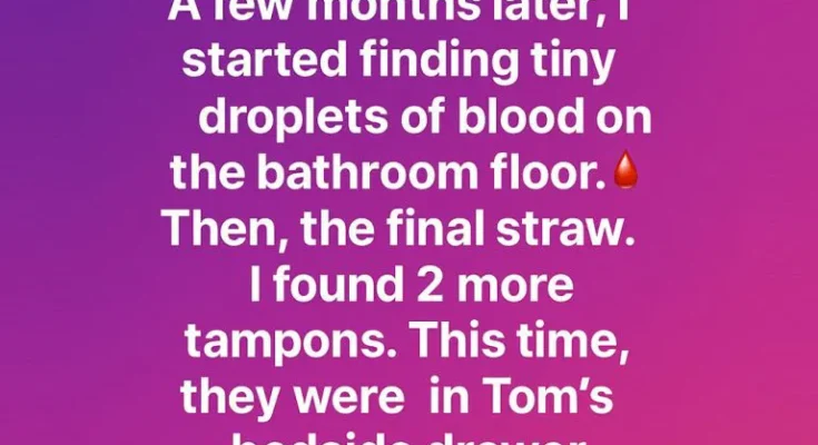 However, over the next few months, more small things caught my attention — faint red stains on the bathroom floor, tissues hidden in the trash, and Tom growing distant and nervous.