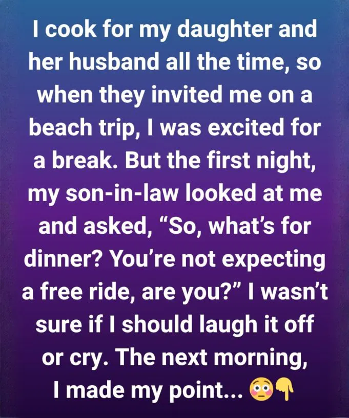 This trip felt like a gift. I imagined resting for once – feeling the salty breeze, losing myself in a book, and letting others care for me for a change. But on the very first night, as we gathered by the bonfire, my son-in-law grinned and joked, “So, what’s for dinner? You’re not expecting a free trip, are you?” His tone was lighthearted, yet his words stung like an unexpected wave.