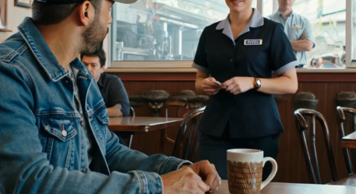 She appeared with a refill pot and a tired smile. “Afternoon, sir. My name’s Jenna. I’ll be taking care of you today.”