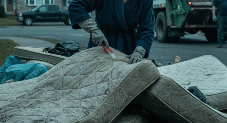 I searched like a woman possessed — climbing over piles of discarded furniture, my shoes sinking into layers of waste and forgotten history. And then, almost hidden beneath a heap of black garbage bags, I saw it: our blue-and-white striped mattress.