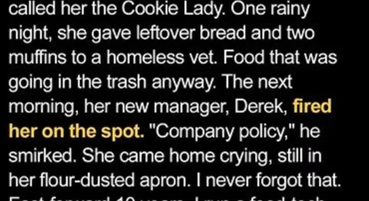 During our talk, he proudly recounted firing an “older woman” years ago for giving away food, calling it “a necessary lesson in discipline.” When he finished, I looked straight at him and said quietly, “That woman was my mother.”